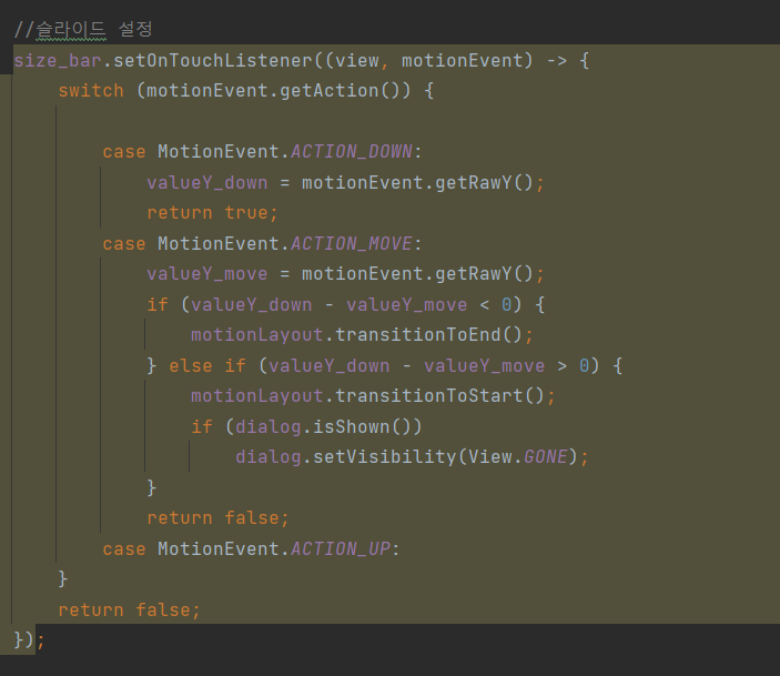 Motionlayout 변수에 transitionToStart()와 transitionToEnd()함수를 활용해서 코드에서 동작을 추가했다.